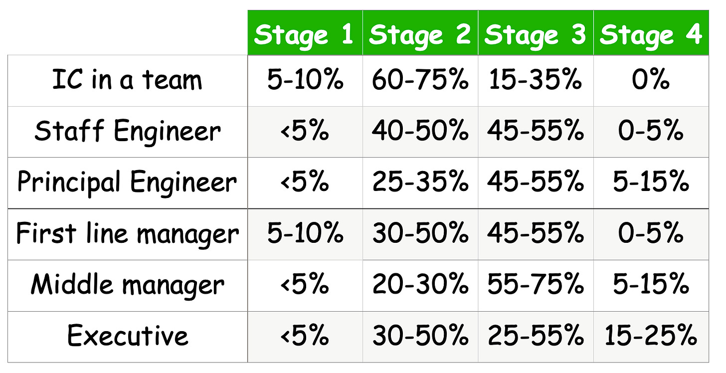 So you should see those stages a continuum in which you slowly change the amount of time you spend in each stage as your role and seniority change. Sometimes, for example after a promotion, going back to a more dependent contribution than when you were in the previous role.